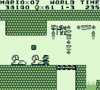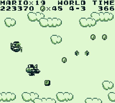 Unique locales aside, Super Mario Land is standard Mario platforming, with the occasional surreal twist. Mario jumps, he runs, he finds a steady rhythm amid the chaos. Goombas and Koopas – now called Nokobons – return, although the Koopa shells explode when you step on them now. Jumping on enemies like the Tokotoko (Moai head) or Gao (Sphinx lion thing) produces a sharp metallic grinding noise when they die, abrasive and disturbing. When you shoot any of the four bosses, they make unnerving crying sounds, like agitated babies. For two blessed stages, Mario Land turns into Super Mario Shoot-em-up. In Stage 2-3, Mario's in a sub, destroying all the denizens of the sea, while in Stage 4-3, Mario reigns terror from on high in a biplane. All in the name of justice, of course. Mario will never be held responsible for any potential crimes, collateral damage, or environmental impact his actions have caused.